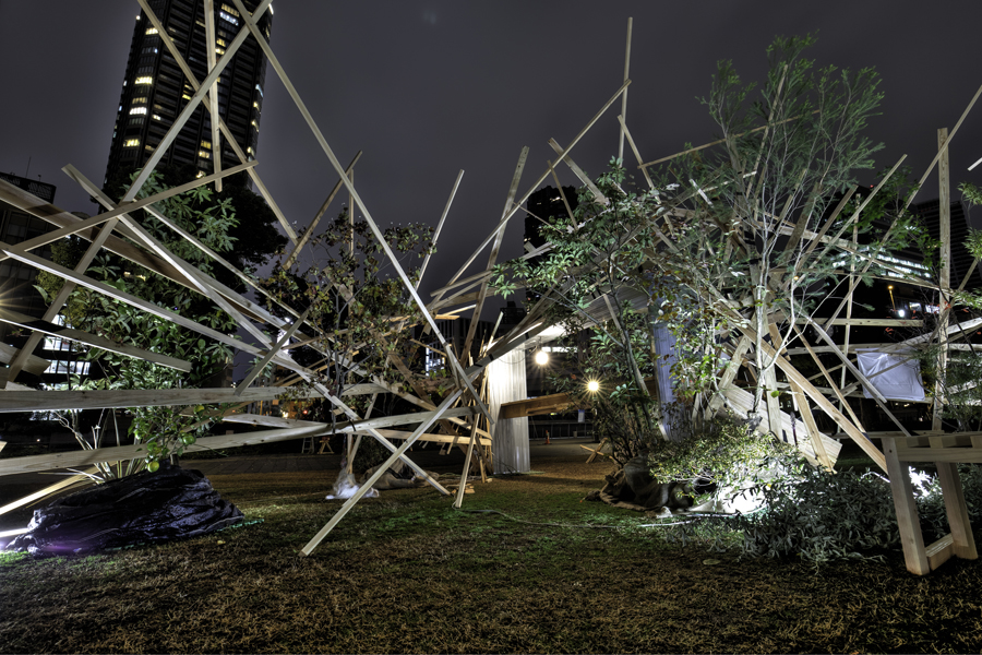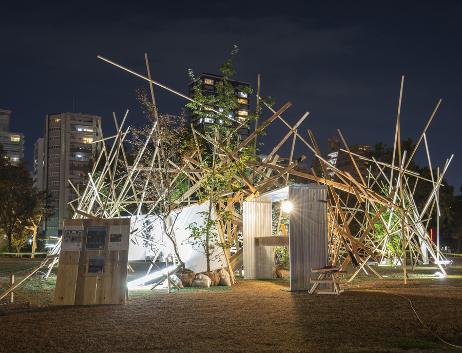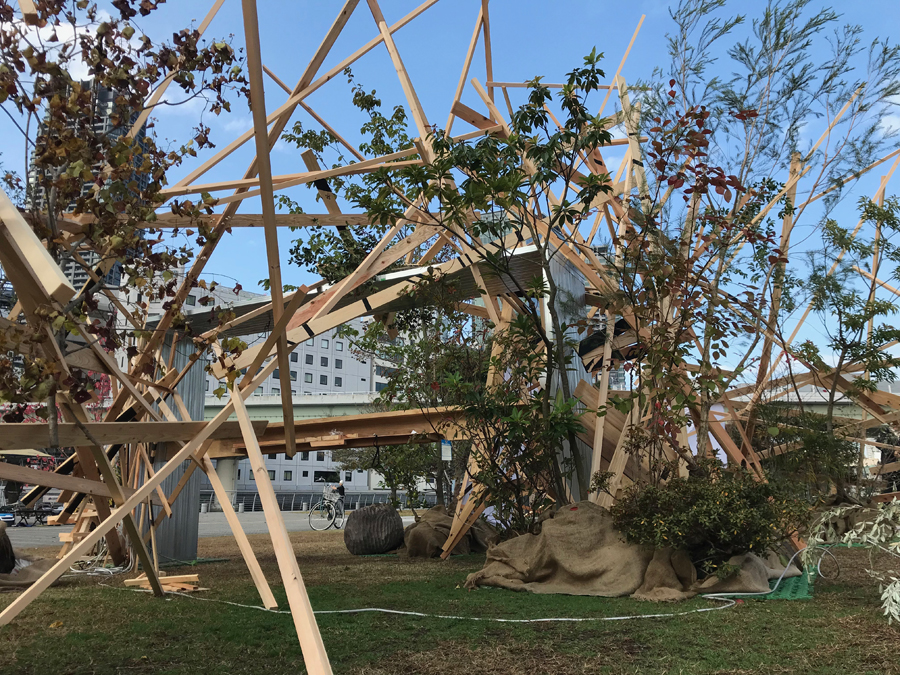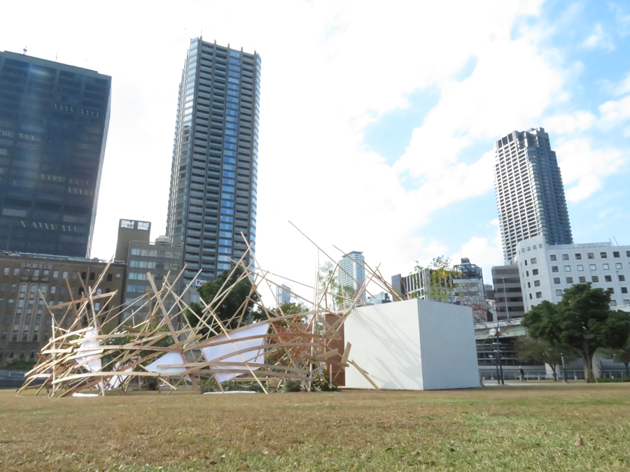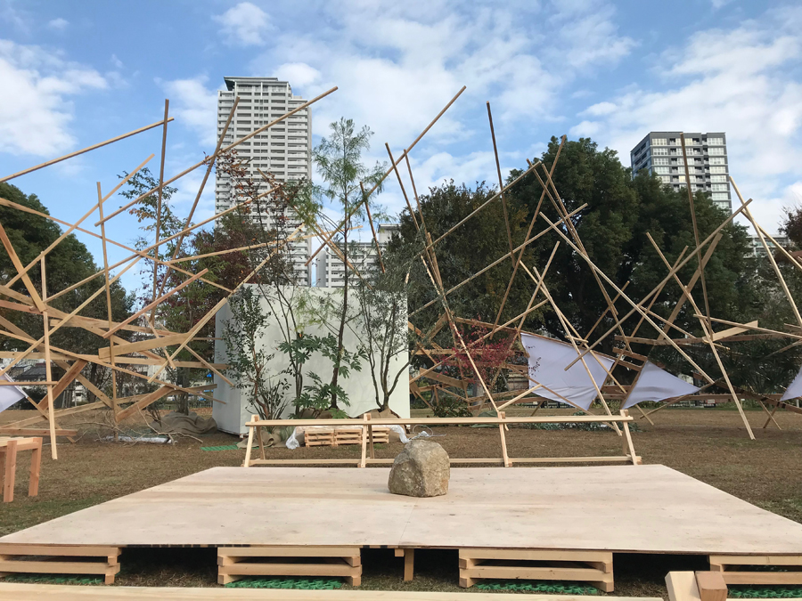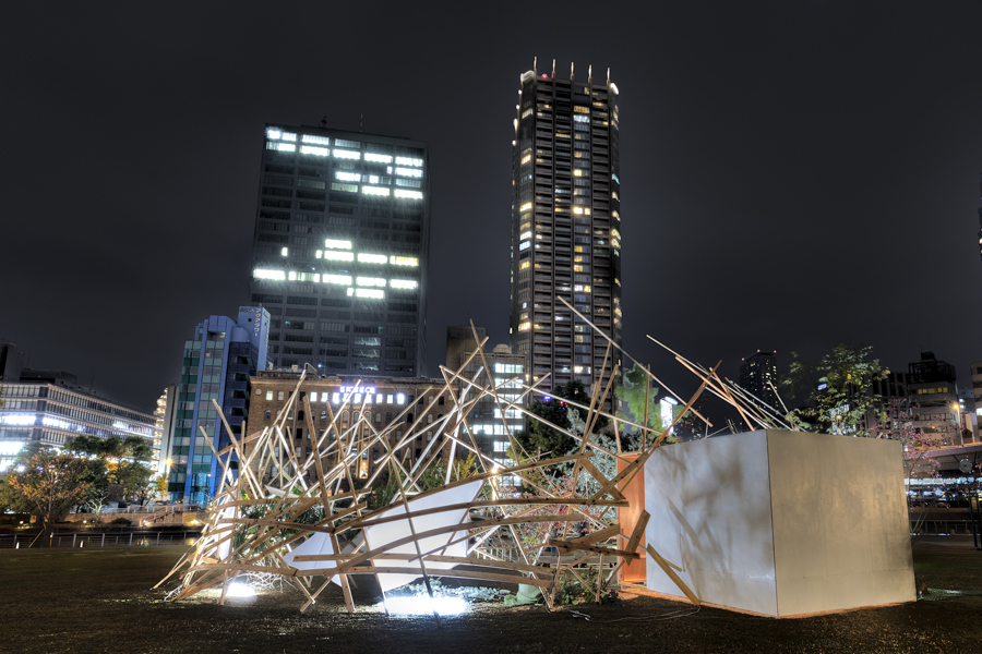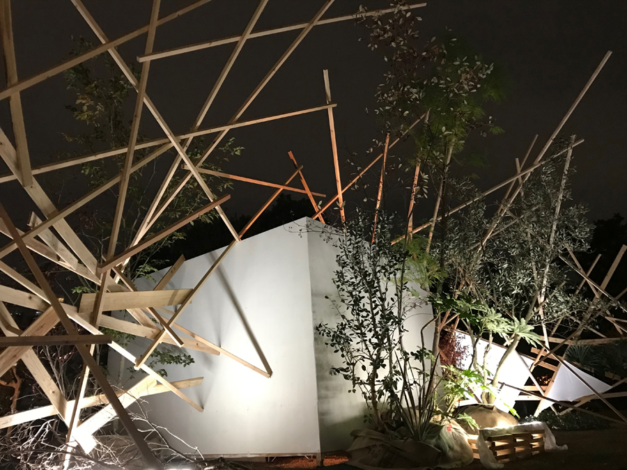 このような場の仕掛けとして、建築家と庭作家のユニットにより、こちらも即興で会場を設えた。それは、乱立する都市のビル群とアーチ状の橋、水の流れを見立てたデザインとするや、そこに草木を添えることで、都市に溶け込ませ、水辺に浮かぶポッと光る籠のような幻想的な空間を生み出すことで、中之島の水辺という場から時空を超え、古の水の都を感じとることが出来るような運命的、偶発的な演奏の高鳴りが実現できたのではないかと考えている。