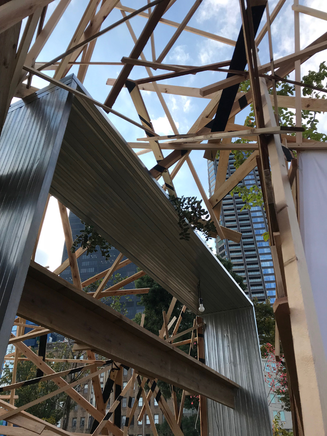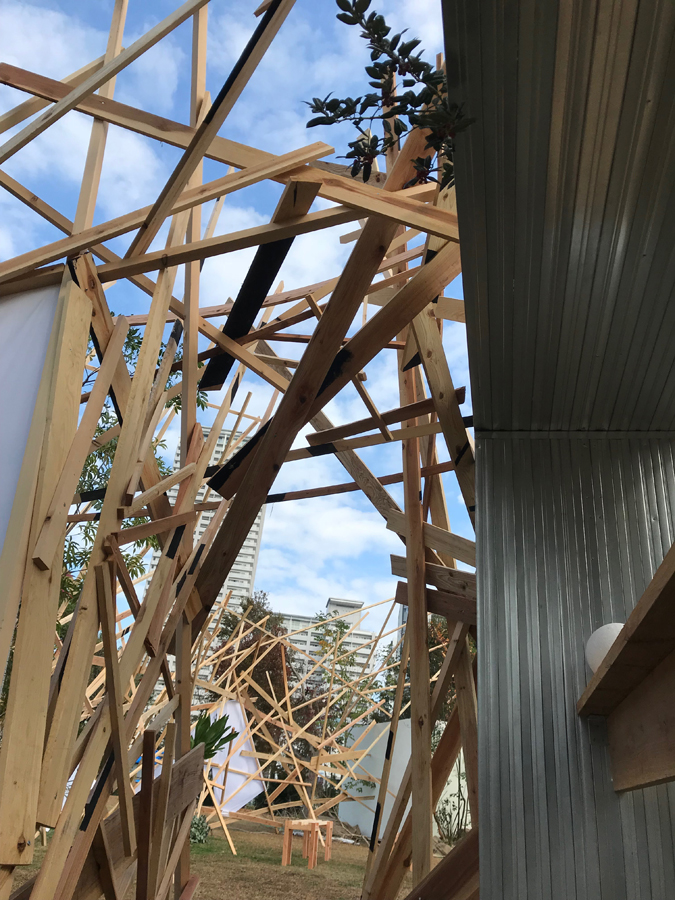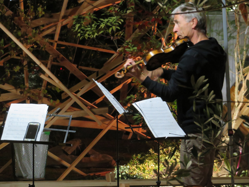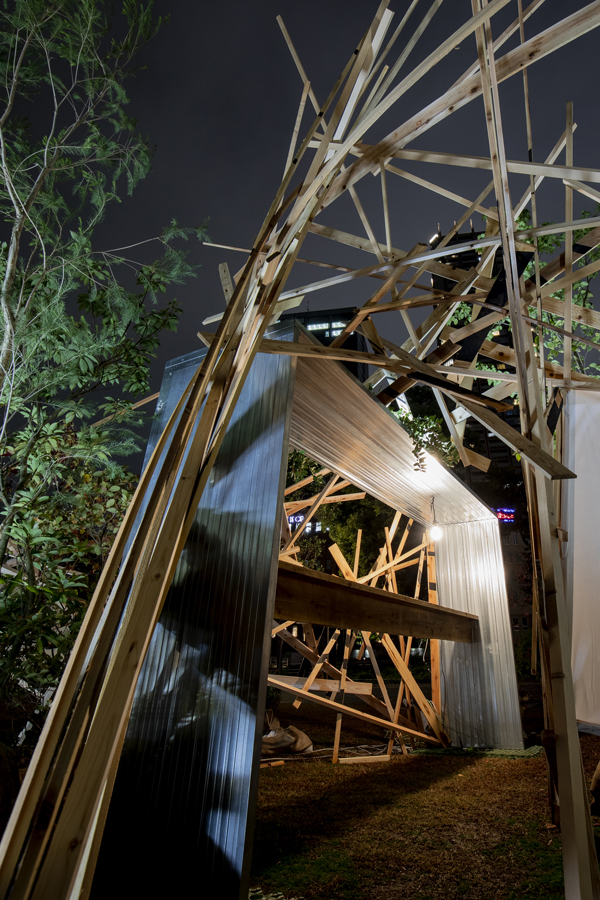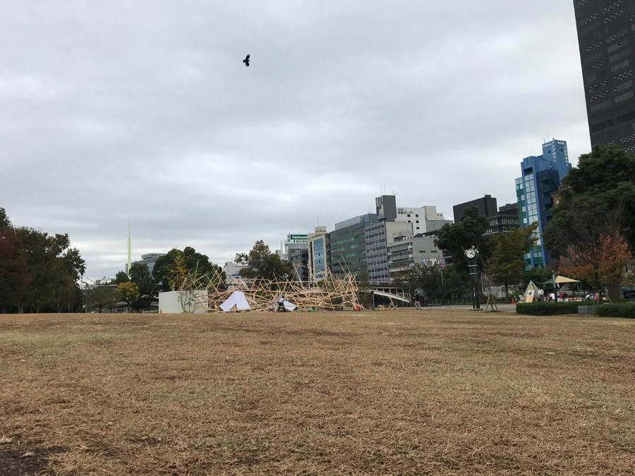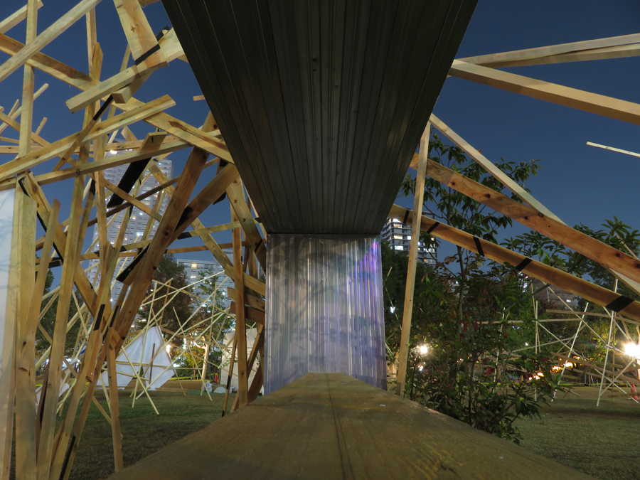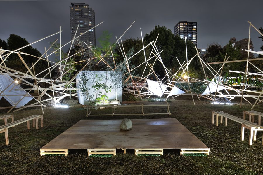 このような場の仕掛けとして、建築家と庭作家のユニットにより、こちらも即興で会場を設えた。それは、乱立する都市のビル群とアーチ状の橋、水の流れを見立てたデザインとするや、そこに草木を添えることで、都市に溶け込ませ、水辺に浮かぶポッと光る籠のような幻想的な空間を生み出すことで、中之島の水辺という場から時空を超え、古の水の都を感じとることが出来るような運命的、偶発的な演奏の高鳴りが実現できたのではないかと考えている。