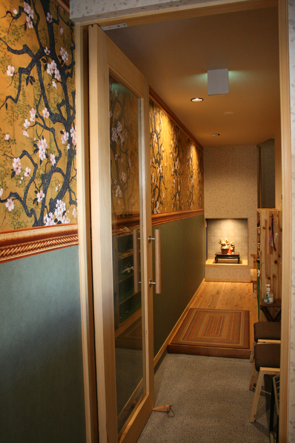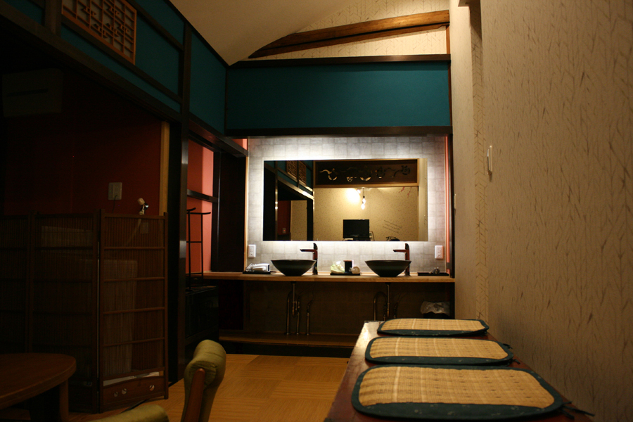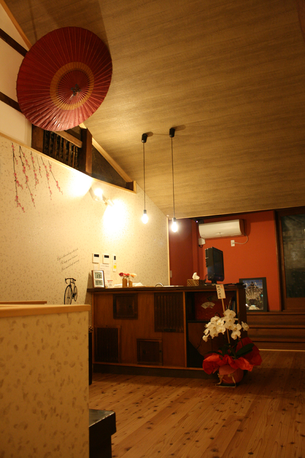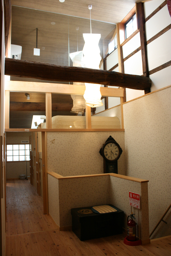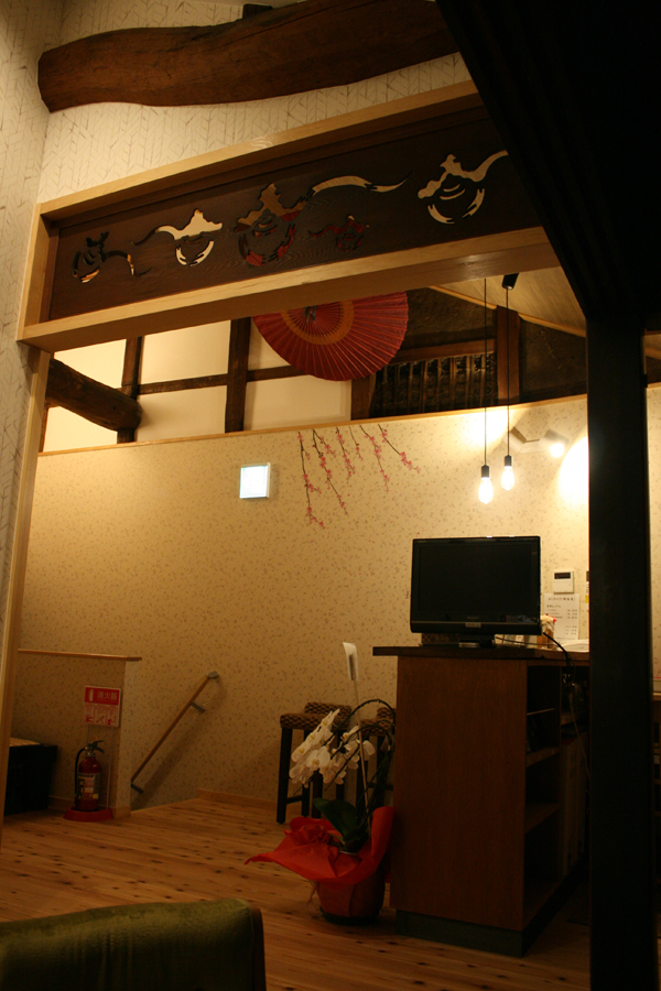 具体的には、床ノ間がある和室はそのまま宿泊室として流用し、一部、水廻りの床ノ間の違い棚は洗面台として、受付ホールは小屋組・大梁を現し、広がりある空間とした。