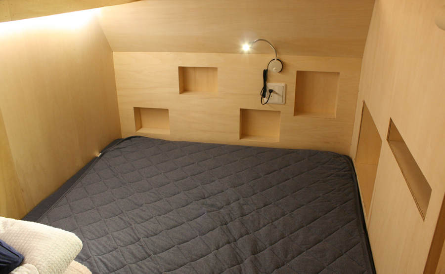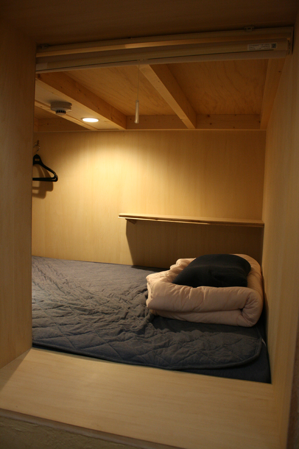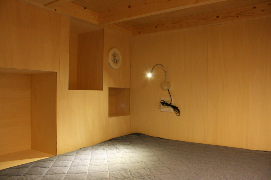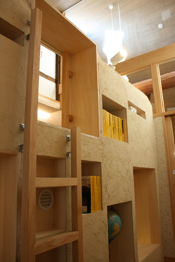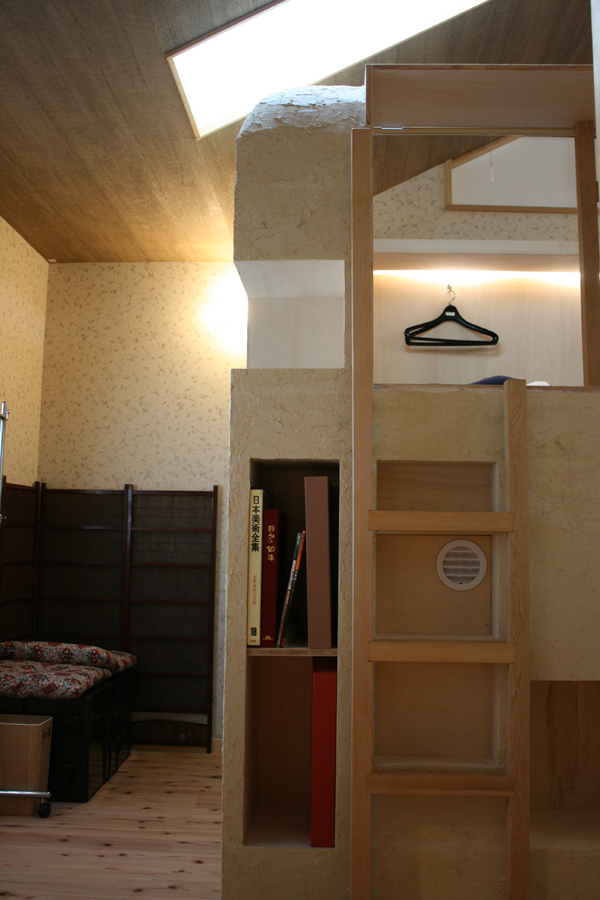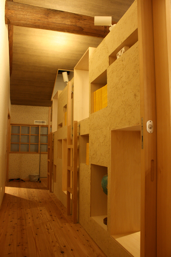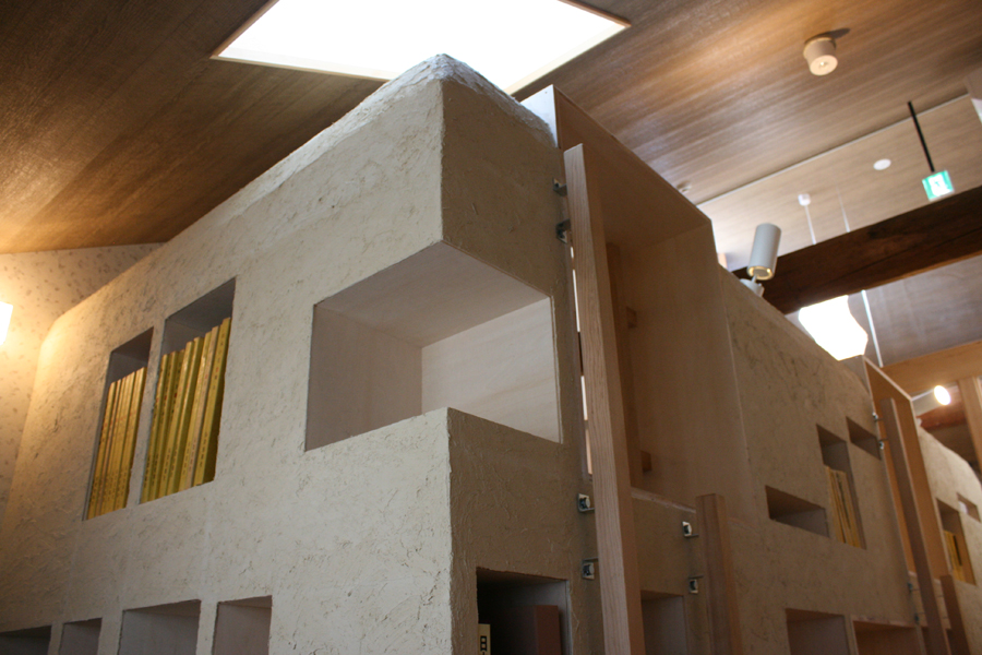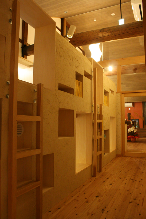 宿泊室2段ベット部分は土蔵の中に潜り込むような半個室の空間を設け、また、その壁面は表裏の凹凸が反転した構造とすることで、表裏のつながり・空間のつながりが感じられるものとした。