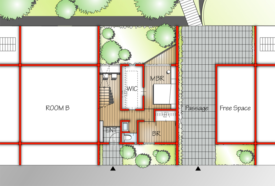 コンセプトは@周辺環境を取り込んだ豊かな生活空間の提供、A当集合住宅の入居者のみならず地域住民も巻き込んだフリースペースによる地域の活性化、とする。@については、敷地北側が低くなっており遠く大山崎の天王山が望めることから、現況1LDKタイプの上下階2ユニットを1ユニットのメゾネット形式に置き換え、2階リビングから移り行く季節や景観等を愉しむ事ができるように計画した。Aについては、1階の半区画をパッサージュに、残り半区画を共同スペースにすることで、人の流れを呼び込みフリースペースや地上部のスロープ下に設けたたまり場、屋外での活動スペース等を活用することで、入居者同士のコミュニケーションや地域の活性化に貢献できるような計画とした。 |